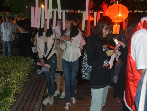 晚七点,在主持人宣布晚会开始后,一阵鼓声响起,社员们带来了极为振奋人心的开场表演——安塞腰鼓。火红的飘带,充满传统风情的服装,激昂的鼓声,点燃了在场所有人的热情。随后,未央埙社为大家带来了动听的埙表演。暖场节目结束后,热情的观众在领完登记卡后陆续进入广场中央,在一个又一个火红灯笼的映照下,迸发出思想的火花,体验猜灯谜的乐趣。穿着社服或红马褂的工作人员耐心地帮助同学们核对答案,场面热闹,其乐融融,所有人的脸上都挂着开心的笑容。在猜灯谜活动进行的同时,广场入口处仍然有秧歌,大鼓等各式各样的表演,不参与猜灯谜活动的同学也可以享受精彩的表演。晚十点,最后几条灯谜猜完。随后,全体成员合影留念,活动圆满结束?/span>
